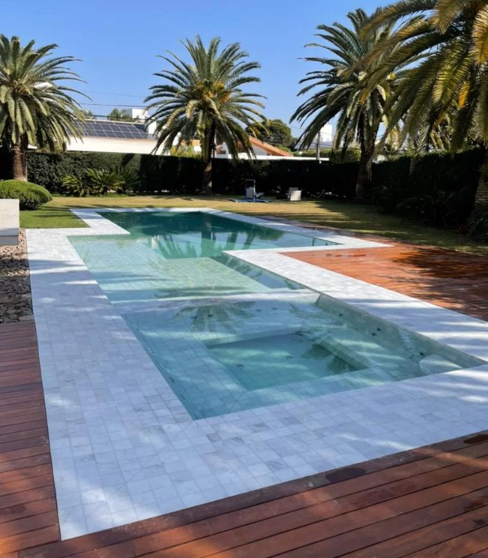 A beleza da pedra Água Marinha se intensifica conforme sua aplicação em diferentes profundidades. Ideal para revestir piscinas, ela cria projetos de beleza suave que se harmonizam com o azul do céu.